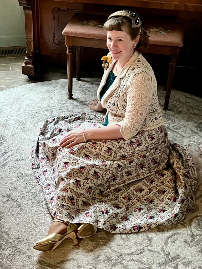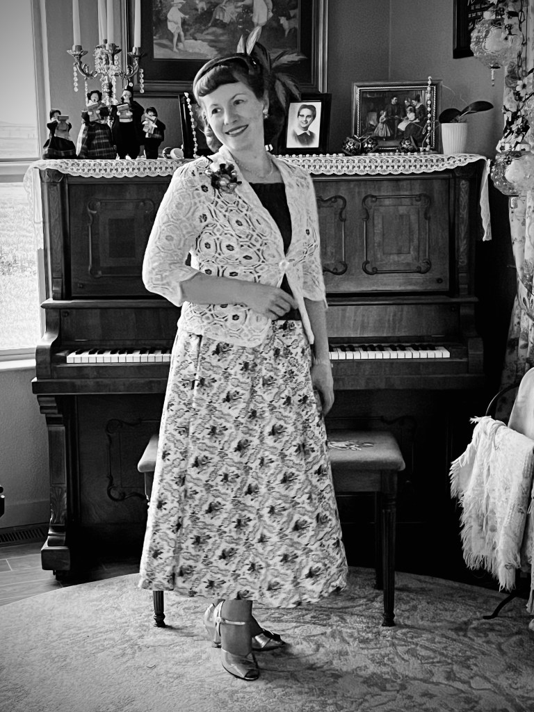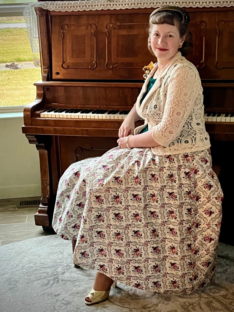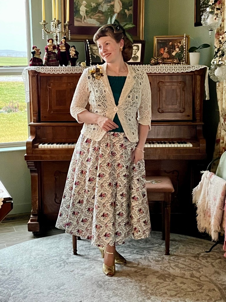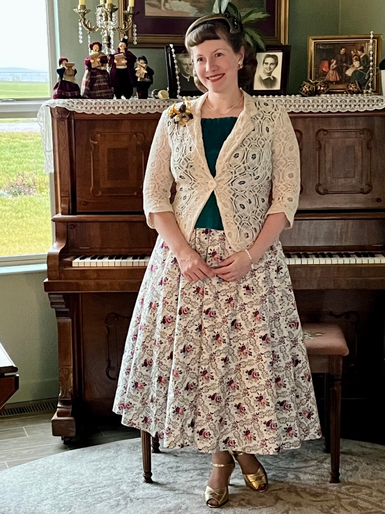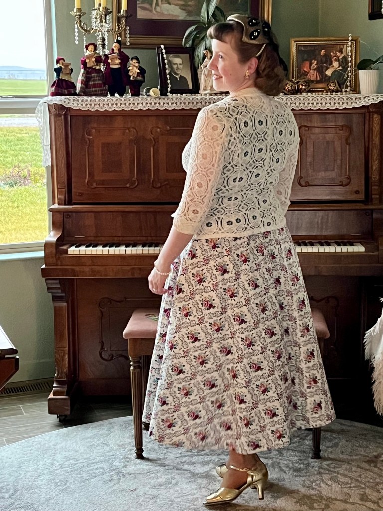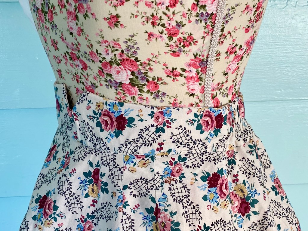 But I’m also tired of making something special that then quickly doesn’t fit me due to my fluctuating sizes at this time of life, so I wanted a more adjustable fit. I left out the back darts, added a few inches to the back seam, and added elastic in the back waist band only, using for the front waist band a shaped one from a different 1950s skirt pattern.