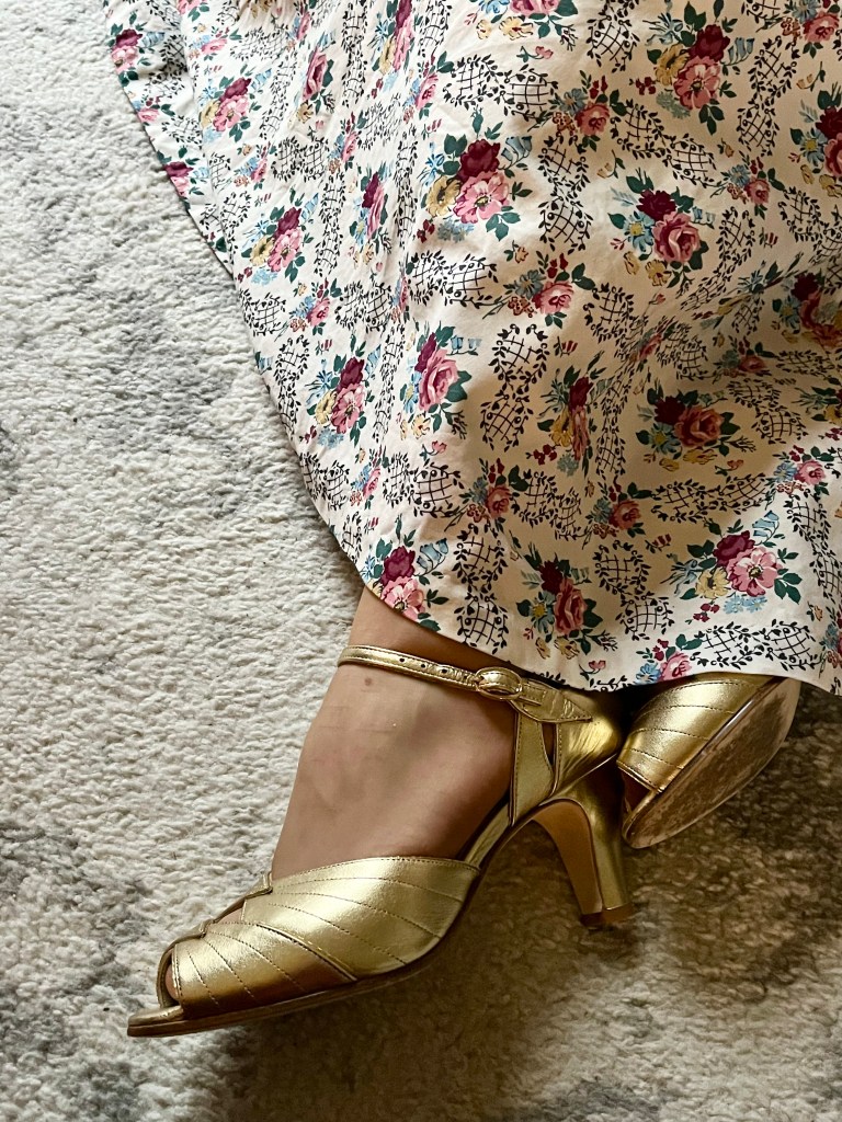 For the Christmas Eve service I paired it with a modern thrifted undershirt, a classic & lovely lace jacket I bought new years ago at Cato’s, gold heels, and a vintage gold hat and corsage.