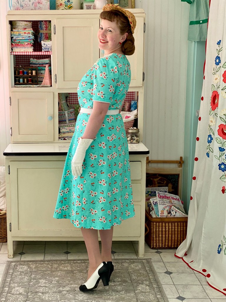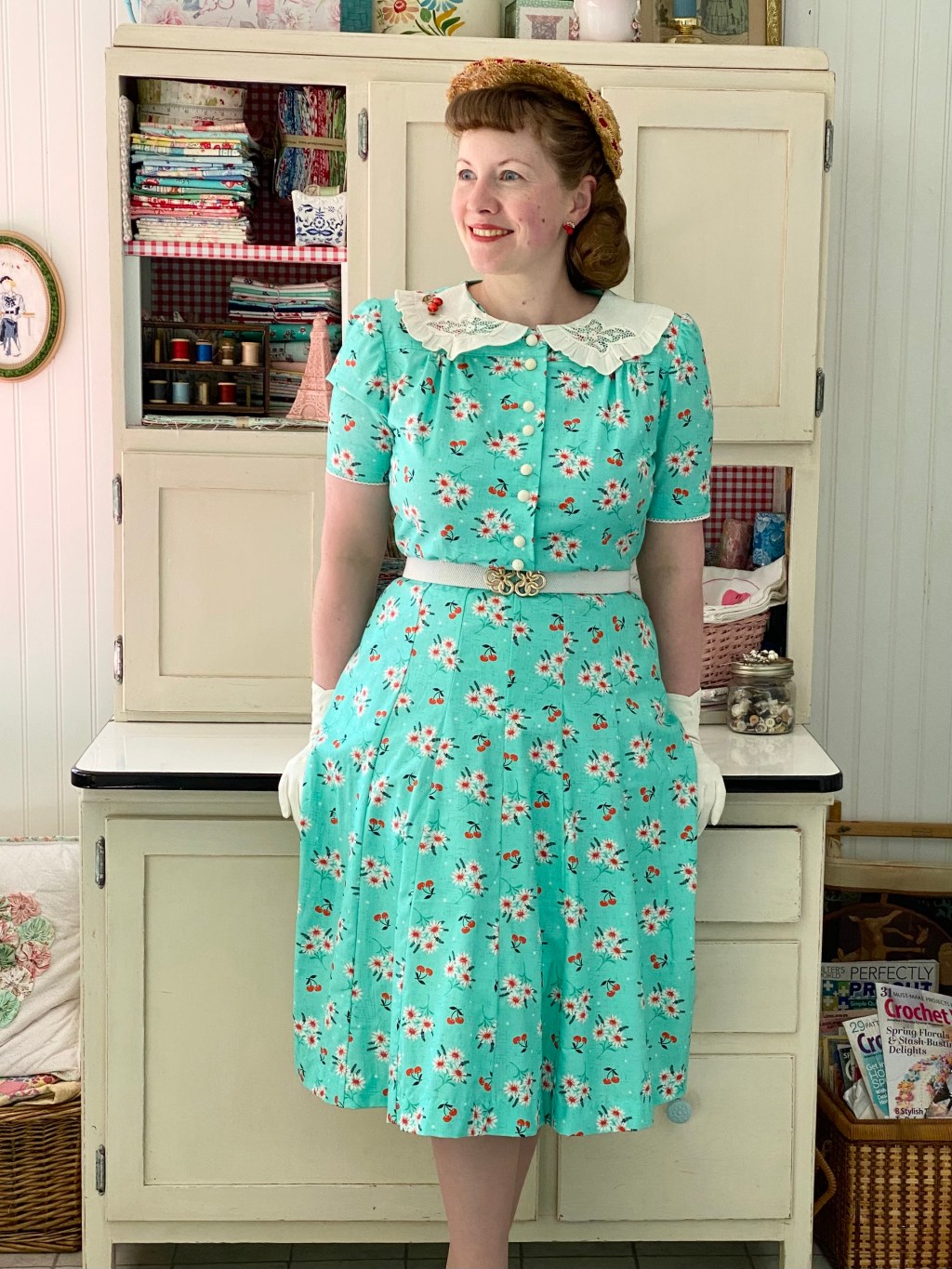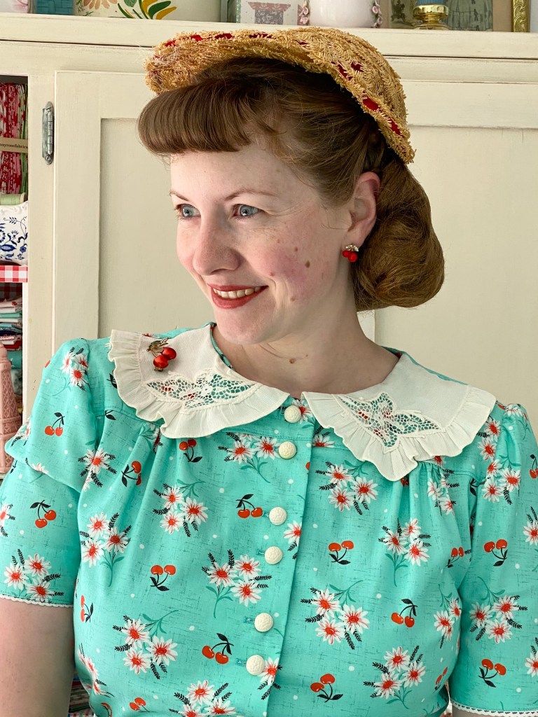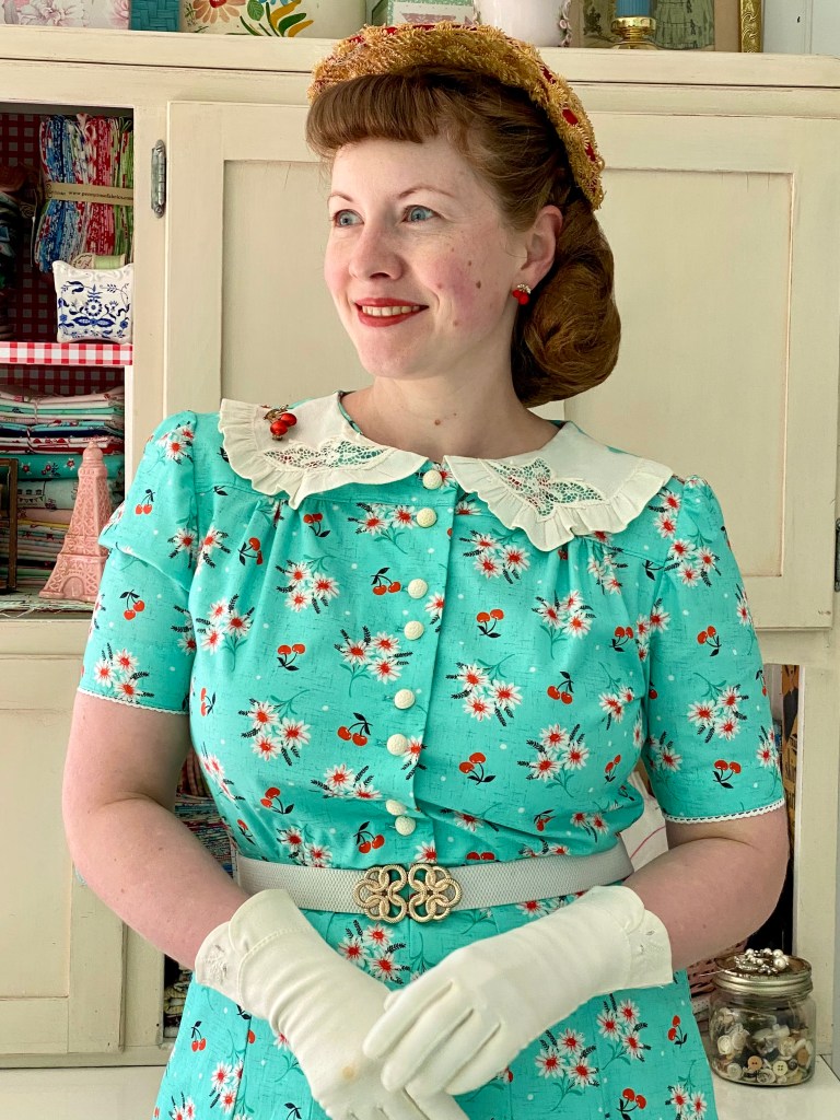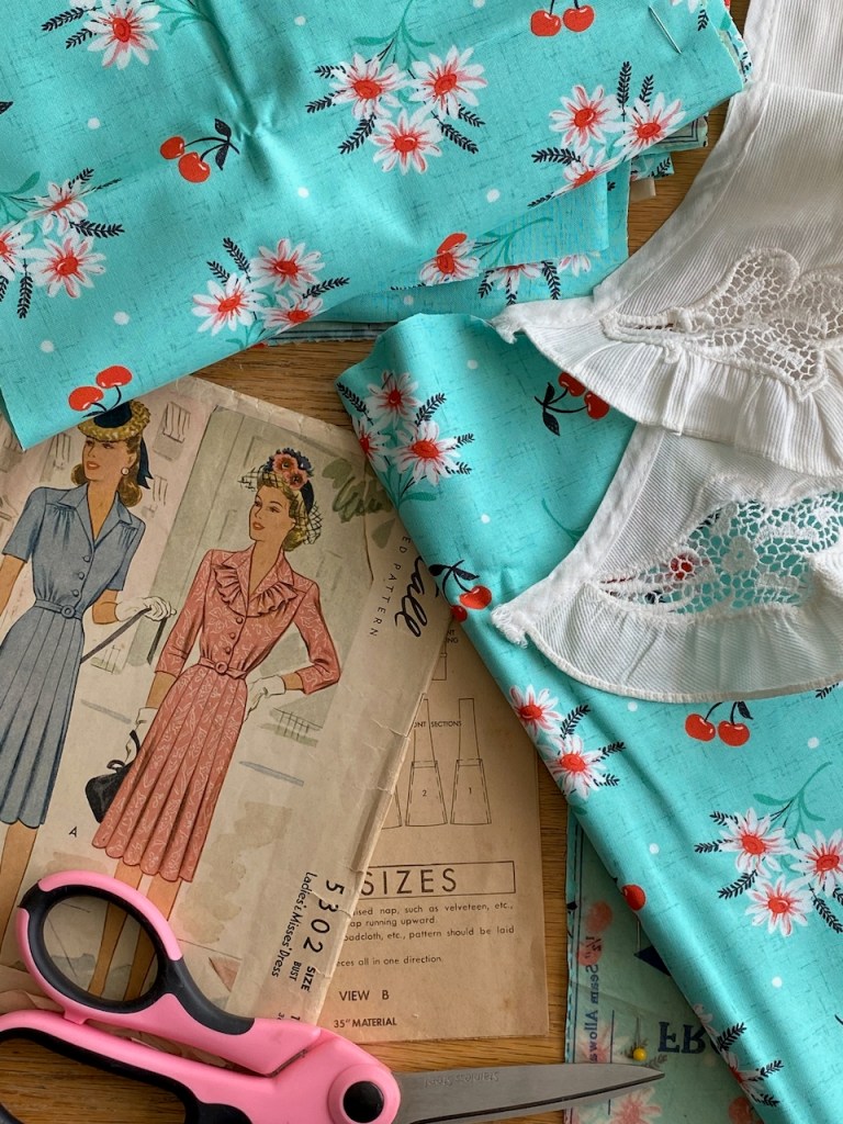 I paired it with a 1940s pattern I hadn’t made for probably 11 or 12 years, but instead of a self collar and ruffle (which is hard to get to look right with quilting cotton) I opted for this lovely vintage collar which I’ve had for ages, waiting until the right project. I think it was a perfect match for this one!