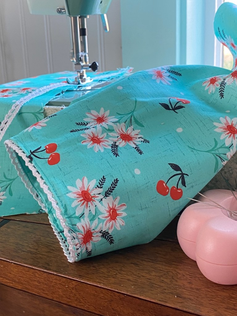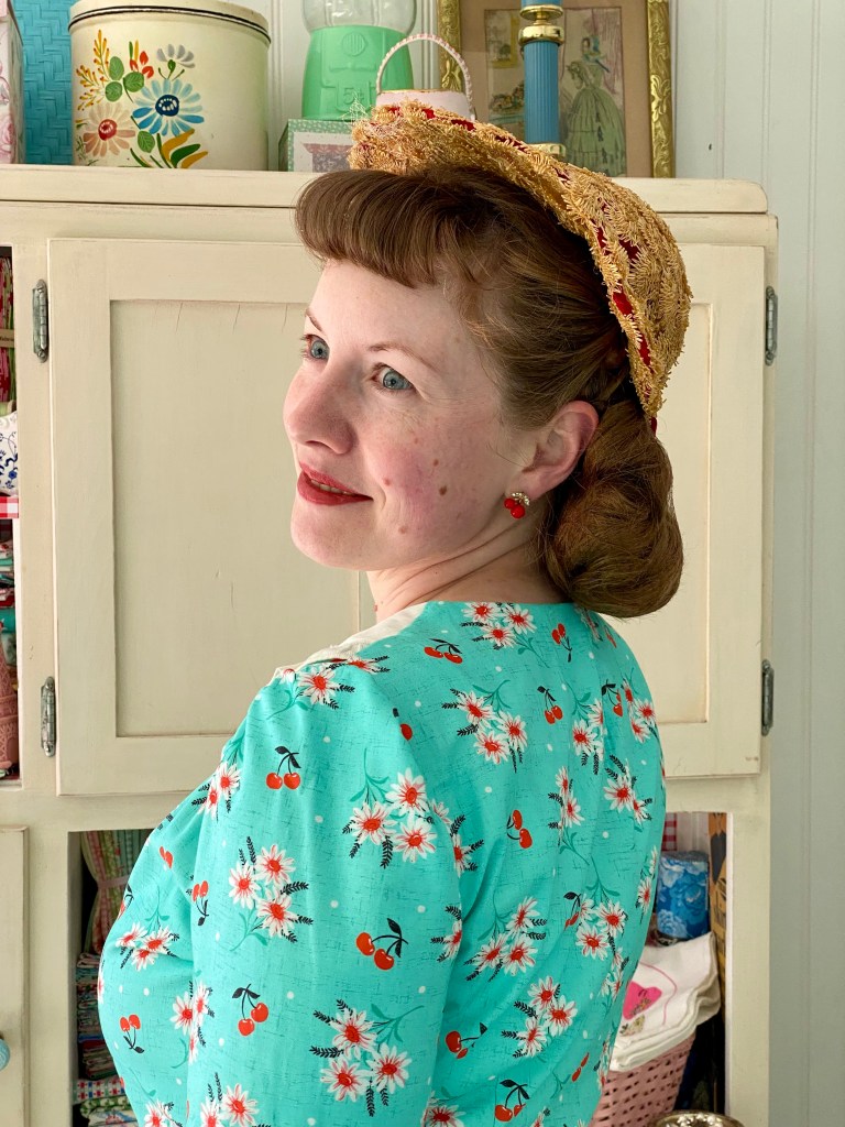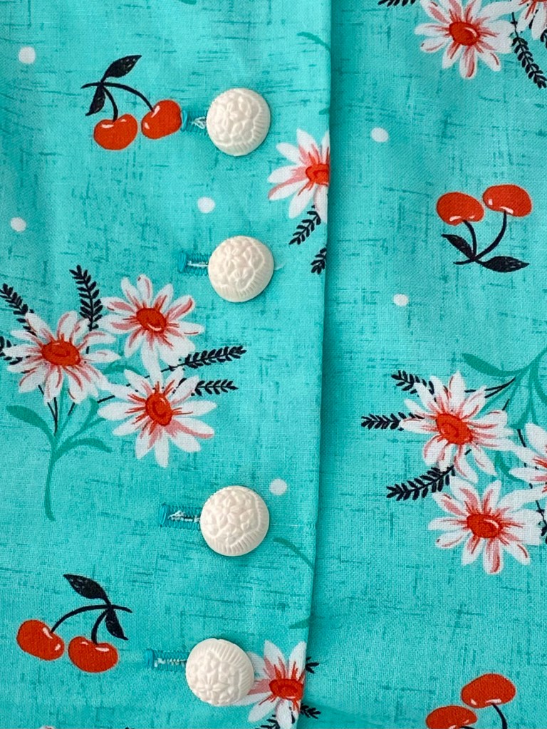 A few years ago I snagged a few yards of my very favorite print in the Julia fabric line by Moda. The whole line was delightful, but the larger daisies & cherries & polka dots on the perfect shade of aqua was hands down just perfection (it also came in yellow and navy). I got a dress length of it at some point when it went on sale, but then got pregnant and never sewed with it.